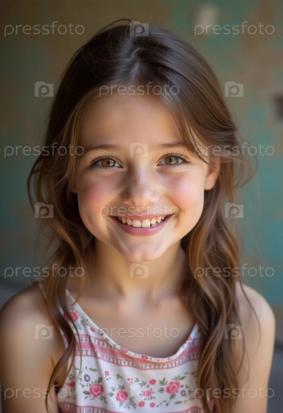 Молодая белая девушка с красивыми глазами и волнистыми волосами стоит, мягко улыбаясь.Ее игривое поведение просветляется, когда она позирует в уютном помещении во Франции.Генеративный ИИ