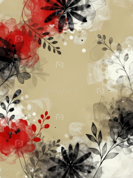 Мягкие красно-черные цветы с зелеными листьями расположены вокруг простого бежевого фона.Этот дизайн выделяет цветочные элементы и смешивает цвета для визуального интереса Generative AI
