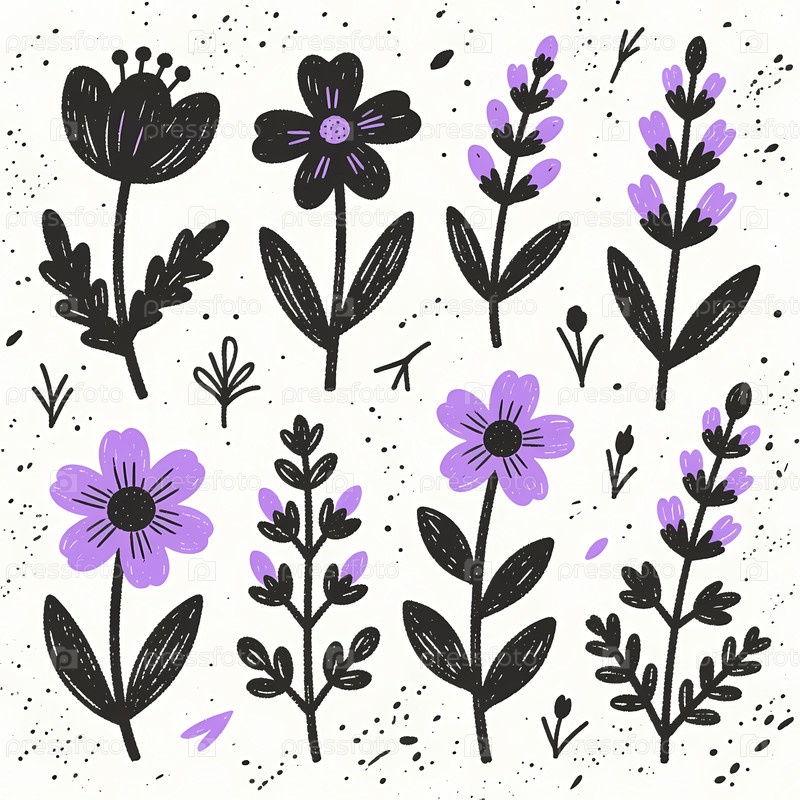 Различные цвета с черными контурами и фиолетовыми листьями появляются на белом фоне.В дизайне представлены различные формы и размеры растений, расположенных в аккуратном рисунке Generative AI