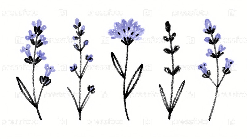 Различные цвета с черными контурами и фиолетовыми листьями появляются на белом фоне.В дизайне представлены различные формы и размеры растений, расположенных в аккуратном рисунке Generative AI