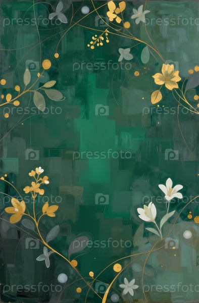 Ярко-желтые золотистые цветы и белые цветки выделяются на зеленом фоне, создавая декоративный дизайн