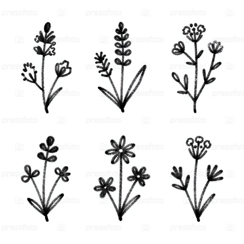 Различные растения и цветы нарисованы черным на белом фоне.Дизайн имеет шесть различных цветочных аранжировок.Каждый из них имеет разные формы и размеры Generative AI