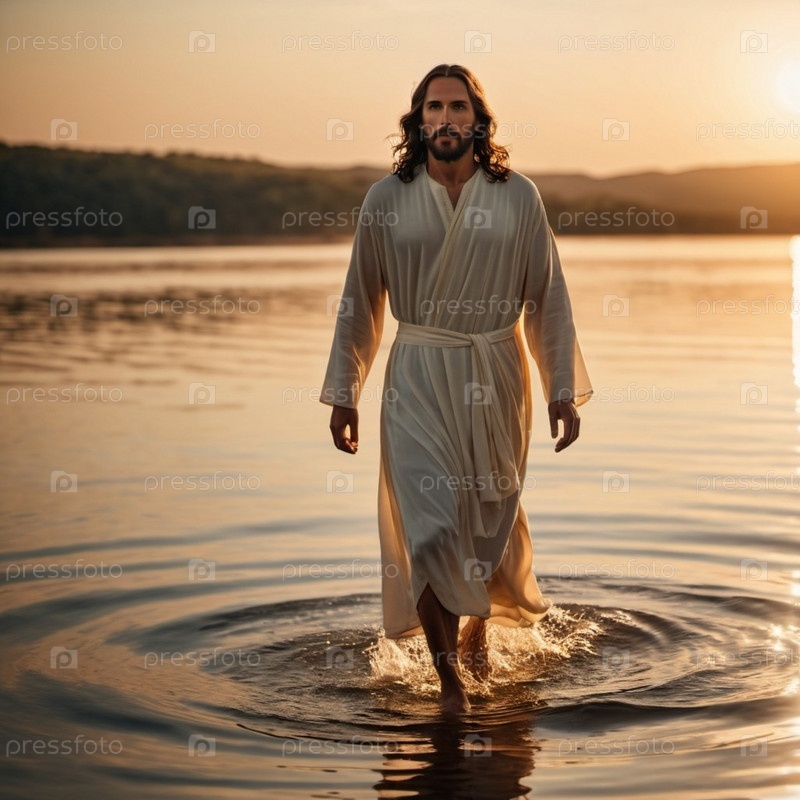 Иисус Христос. спокойная фигура ходит по тихим водам на закате, создавая волны в отражающем озере. теплый золотой свет купает сцену, духовную атмосферу спокойного момента. созданный ИИ