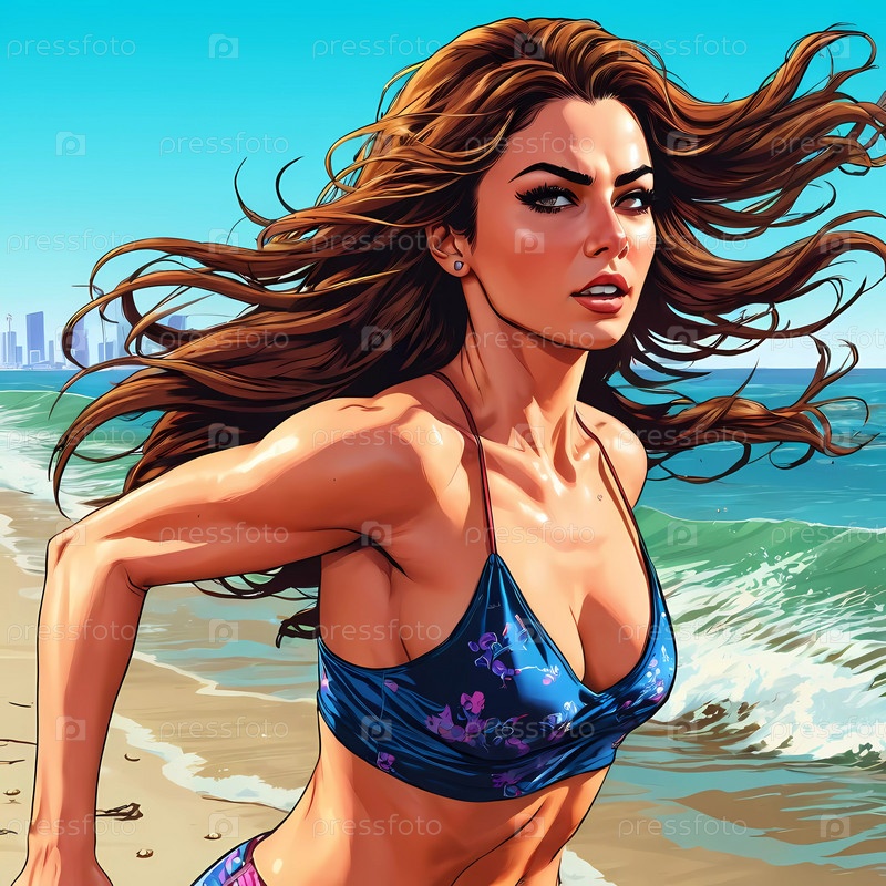 Женщина наслаждается оживленным днем на пляже, бегая вдоль береговой линии в купальнике, ее длинные волосы свободно текут в океаническом бризе, а волны мягко обнимают ее ноги