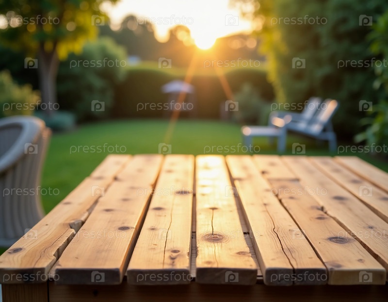 Красиво выполненный деревянный стол стоит в тихом саду, освещенном теплым светом заходящего солнца Generative AI