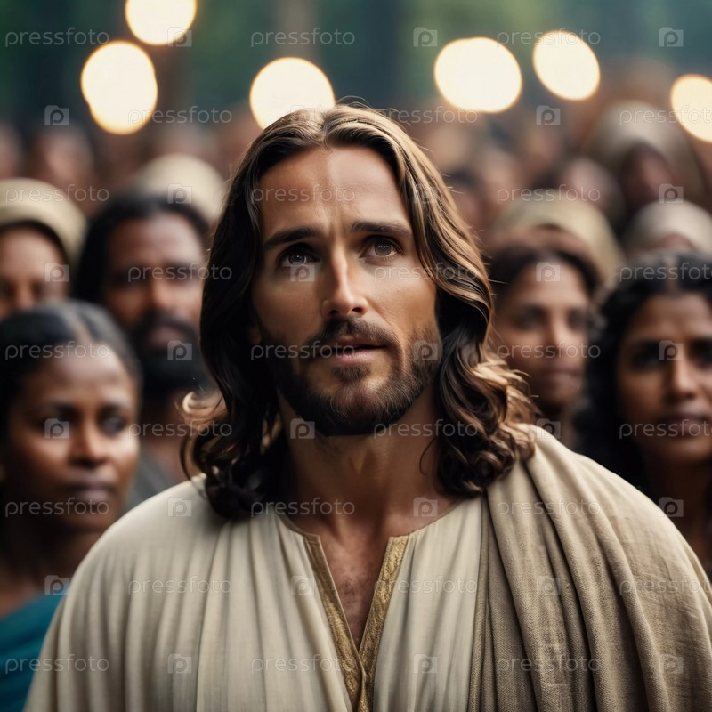 Иисус Христос стоит посреди разнообразного собрания, передавая послание надежды и веры в окружении внимательных последователей
