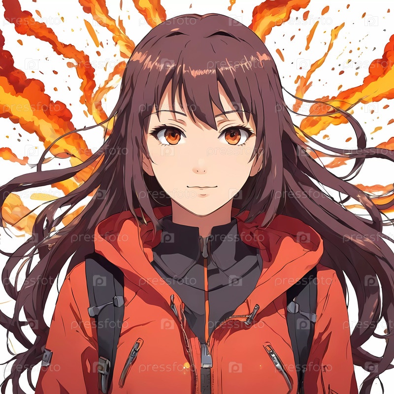 На фоне огненных извержений вулканическая девушка демонстрирует решимость и силу, а ее расплывчатые волосы и яркий наряд иллюстрируют связь с окружающими элементами