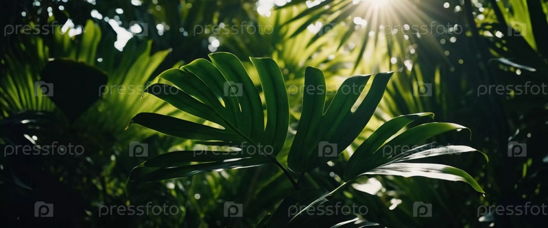 Живые листья Монстеры висят изящно, купаются в мягком солнечном свете, фильтрующемся через навес тропического дождевого леса, создавая спокойную атмосферу