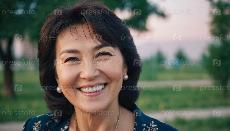 Веселая 50-летняя женщина наслаждается солнечным днем в парке, демонстрируя свою сияющую улыбку и элегантные жемчужные серьги, когда она обнимает момент