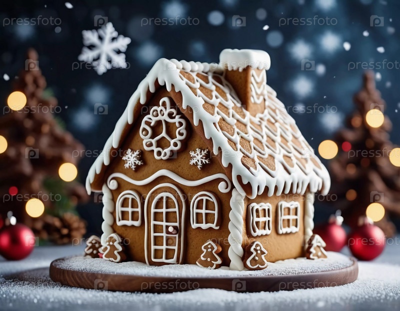 На тарелке выделяется праздничный дом из пряников, украшенный мороженым, конфетами и снежными декорациями.Он отражает дух рождественской выпечки, окруженной веселой атмосферой.Генеративный ИИ