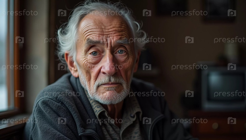 Пожилой мужчина уверенно стоит, одетый в черную куртку. Мягко освещенный фон. Портрет русского человека 60-70-80 лет. Серьезное, мудрое, продуманное лицо. Пенсионер с седыми волосами. Генеративная ИИ