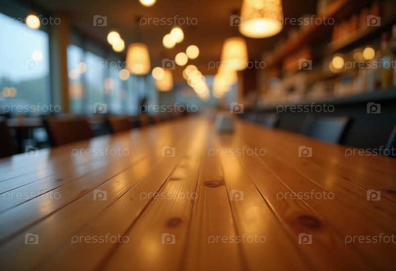 Теплый деревянный стол создает уютную атмосферу в оживленном кафе.Мягкие огни освещают фон, где посетители наслаждаются напитками и разговорами.Генеративная ИИ