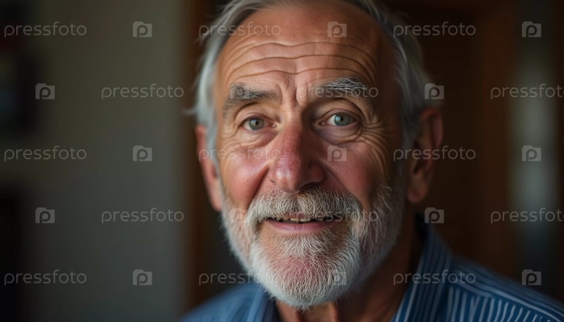 Пожилой мужчина, житель США, с белыми волосами и бородой радушно сияет, демонстрируя свое дружелюбное поведение в непринужденной одежде