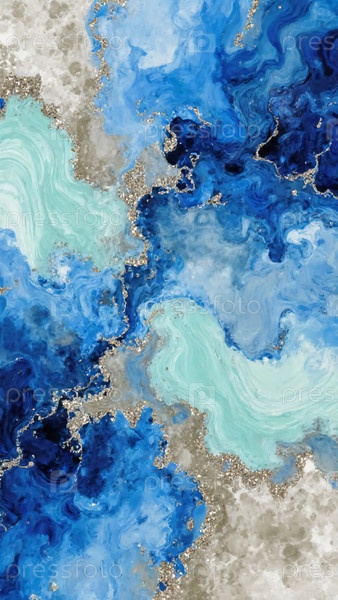 Вибрирующие волны синего танцуют с мягкими бежевыми тонами, отмеченными проблесками золота, создавая очаровательный шедевр спиртного чернила, который вызывает восхищение