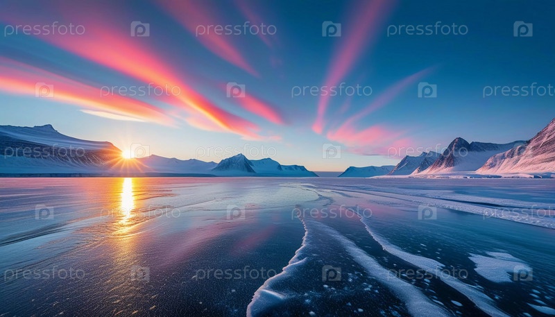 Спокойный арктический ландшафт тундры покрыт морозом при восходе солнца, излучая золотистый свет над ледяной местностью и освещая тонкие образования льда