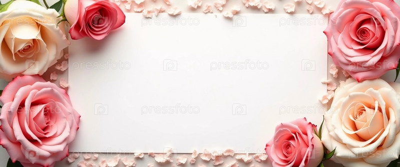 Деликатные розовые розы окружают пустое пространство, идеально подходит для написания личных сообщений.Эта прекрасная цветовая аранжировка добавляет элегантность любому случаю.Фон на день рождения, День матери, День святого Валентина