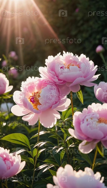 Живые цветы пионки в розовых оттенках стоят высоко, когда на заднем плане заходит золотое солнце, создавая спокойный и атмосферный пейзаж, наполненный теплом