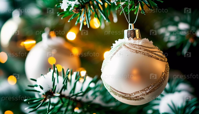 Блестящие орнаментные шары из яркого золота висят на ветке пышной ель. Мягкие, теплые огни мерцают, улучшая праздничный дух Рождества. С Новым годом. Анаморфический бокех. Генеративный ИИ