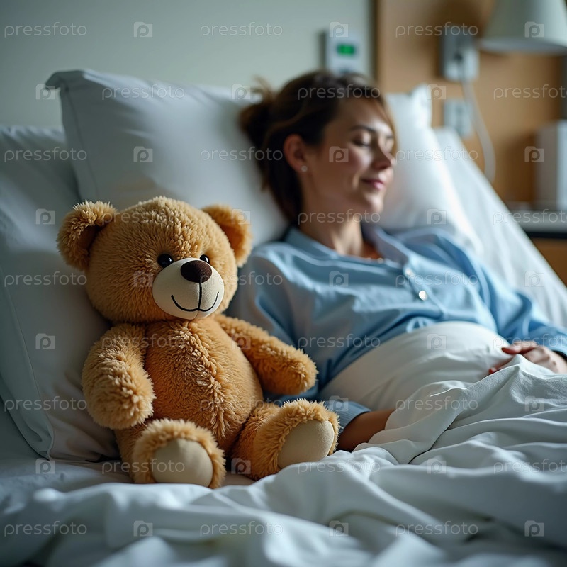 Женщина лежит в больничной постели, одета в светло-синее платье и спокойно отдыхает со своим плюшевым медведем рядом с ней