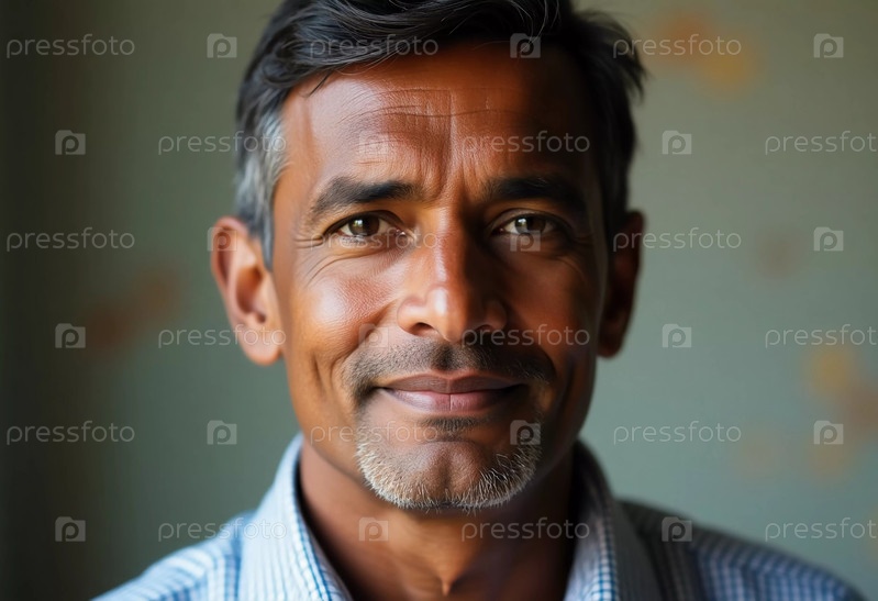 Мужчина средних лет из Индии демонстрирует теплую улыбку, отражающую удовлетворенность и мир.На фоне мягких цветов он, кажется, охватывает спокойствие своего окружения