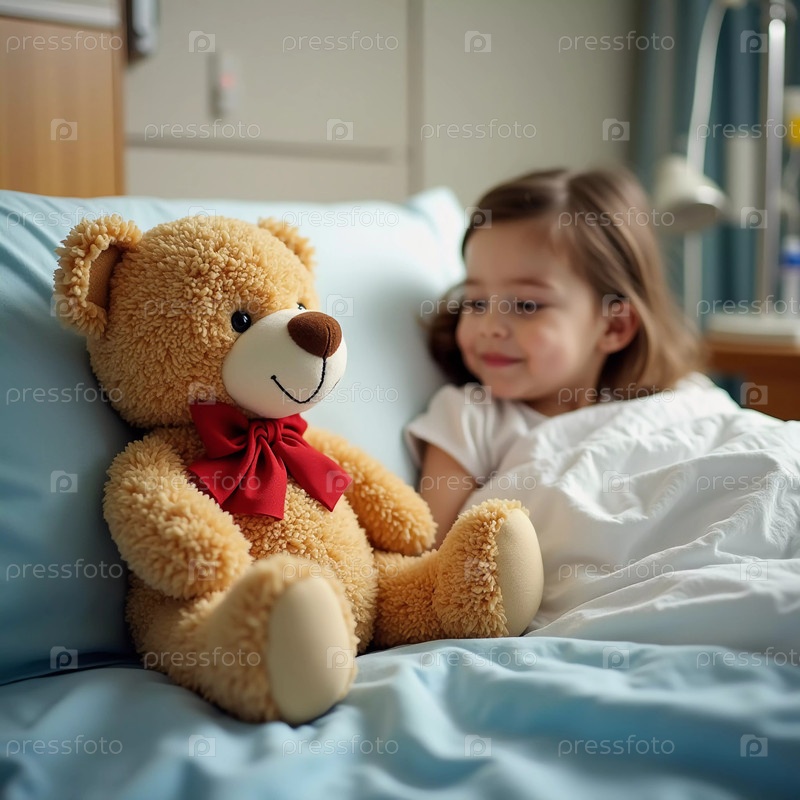 В больничной палате маленький ребенок улыбается своему плюшевому медвежонку, находя утешение и компанию в сложное время.Мягкие одеяла окружают ее, улучшая момент, полный надежды