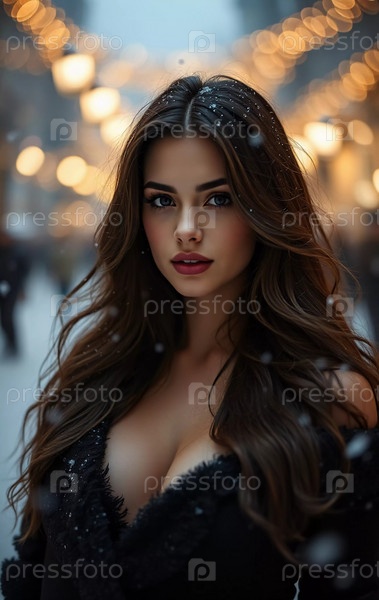 Потрясающая женщина смотрит мягко, когда вокруг нее падают снежинки в восхитительной городской обстановке, захватывая магию рождественского сезона