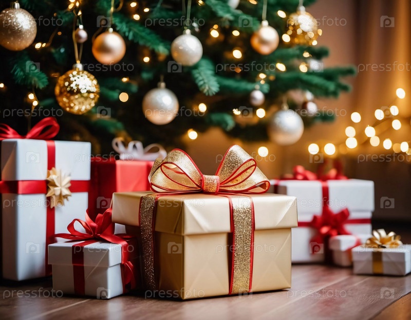 Празднично упакованные подарки в окружении красочных рождественских шаров под красиво украшенной пихтой во время радостного новогоднего сезона