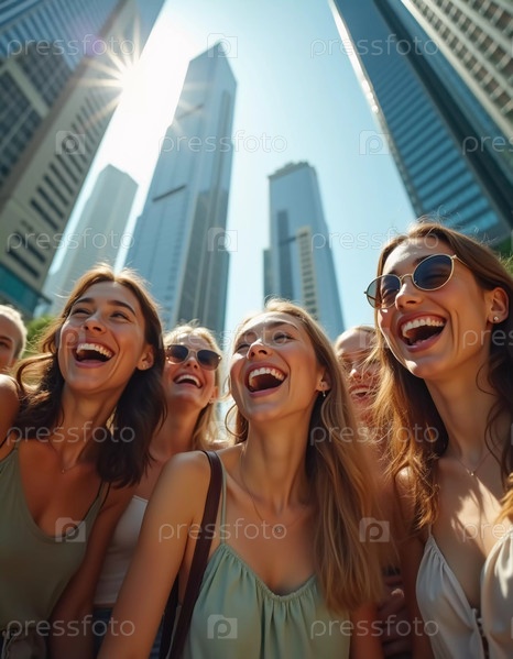 Живая группа друзей, наслаждающихся своим временем вместе, смеясь от всего сердца под солнцем. возвышающиеся небоскребы обеспечивают потрясающий фон, отражая их радость и товарищеские отношения
