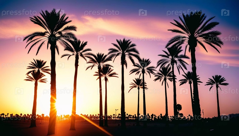 Золотые лучи заходящего солнца фильтруют пальмы, бросая на землю длинные тени, а яркие цвета окрашивают вечернее небо в потрясающие оттенки Generative AI