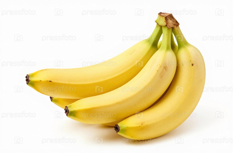 Группа бананов сидит на белом фоне. Плод демонстрирует свою гладкую желтую кожуру. Он предлагает четкое представление о своей естественной форме и цвете без отвлекающих факторов Generative AI