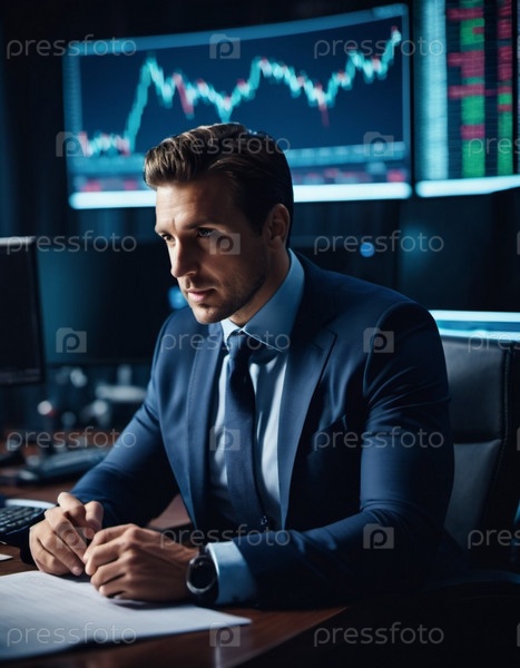Трейдер, ориентированный на цифровой финансовый анализ сидит за компьютером в элегантном торговом зале, заполненном экранами, отображающими рыночные тенденции и данные