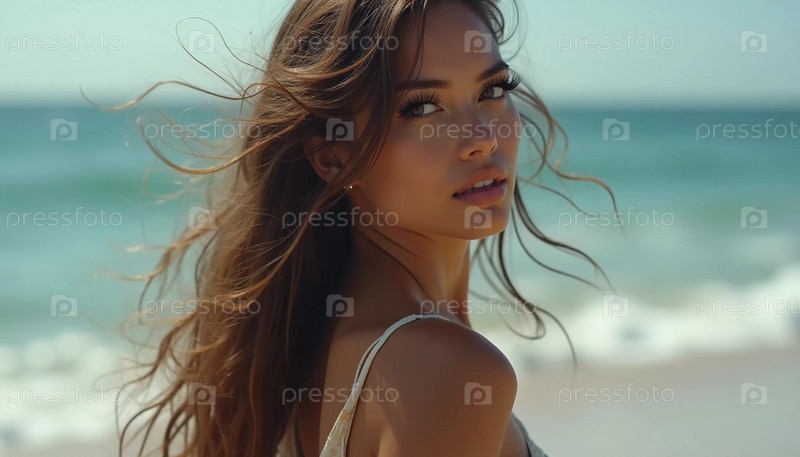 Брюнетка в купальнике смотрит назад, стоя возле береговой линии. Нежные морские волны обнимают ее у ног под чистым голубым небом. Длинные волосы, красивое молодое лицо. Путешествия и реклама одежды