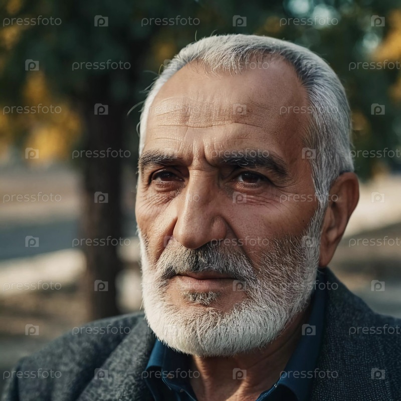 Пожилой армянский мужчина с мудрым выражением лица появляется глубоко в мыслях, окруженный красотой природы в тихом месте на открытом воздухе, воплощая чувство спокойствия Generative AI