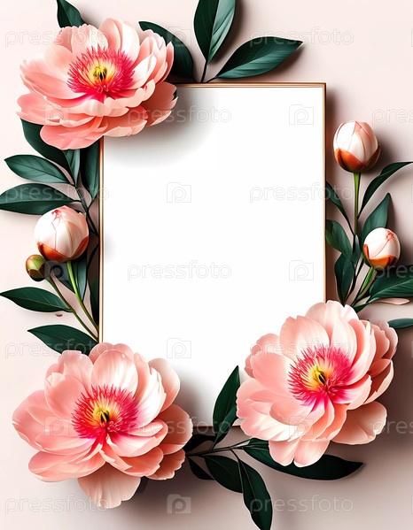 Прекрасные розовые пионы с пышными зелеными листьями создают элегантную границу вокруг пустого пространства, приглашая к себе личные мысли и художественные прикосновения в спокойной атмосфере