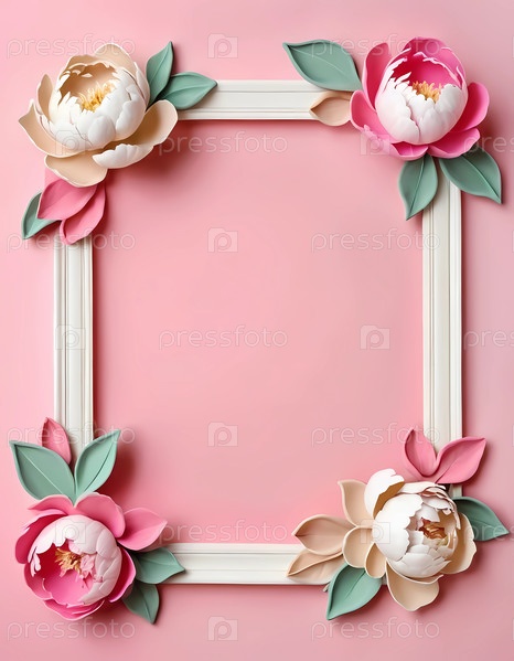 Нежные пионы в оттенках розового, белого и бежевого изящно украшают белую раму на мягком фоне, создавая приятную атмосферу, полную потенциала для искусства