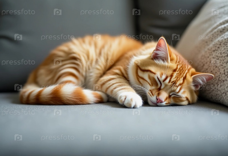Мягкие лапы прячутся под ярко-красным пушистым котом, который глубоко дремлет на сером диване в окружении нежного тепла полуденного солнечного света, фильтрующего атмосферу комнаты