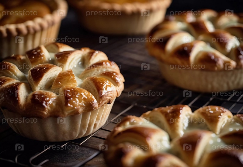 Свежевыпеченные кондитерские изделия и пироги привлекательно расположены на столе в теплой пекарне