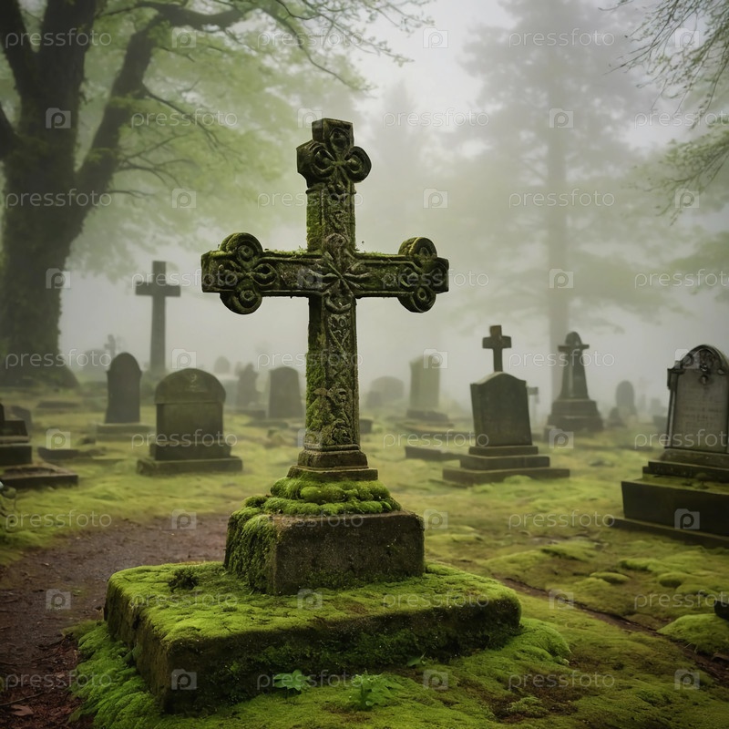 Среди густого тумана мохообразный крест стойко стоит на заброшенном кладбище, в окружении стареющих надгробий и высоких деревьев, вызывая спокойствие и тайну Generative AI