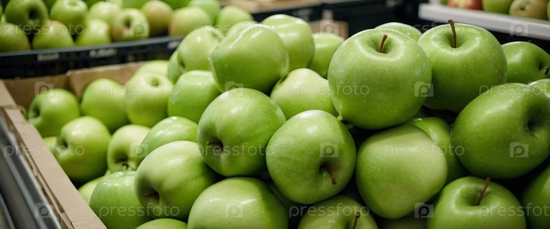 Красочный ассортимент зеленых яблок аккуратно расположен на прилавке супермаркета, приглашая клиентов исследовать и выбирать свежие фрукты