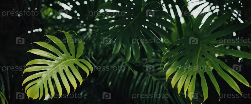 Живые листья Монстеры висят изящно, купаются в мягком солнечном свете, фильтрующемся через навес тропического дождевого леса, создавая спокойную атмосферу