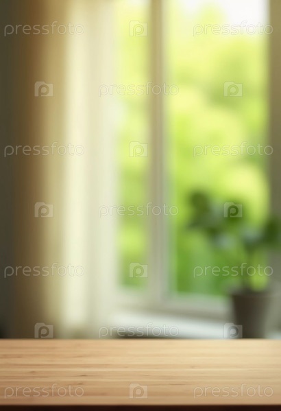 Хорошо освещенный деревянный стол стоит пустым, купается в естественном свете из сада снаружи. зелень мягко размывается на заднем плане, создавая мирную атмосферу для выставок или собраний. генеративная ИИ