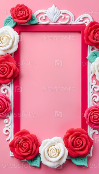 Яркая рама, украшенная красными, розовыми и белыми розами, установлена на мягком розовом фоне, обеспечивая идеальное пространство для личных сообщений или драгоценных воспоминаний