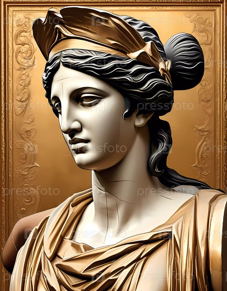 Афродита, олицетворяющая любовь и красоту, изображена в изысканной скульптуре, подчеркнутой золотыми тонами и сложными узорами.Ее спокойное выражение завораживает элегантностью Generative AI