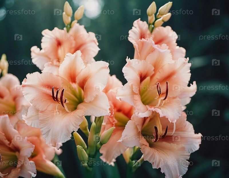 Кластеры потрясающих мечлилий демонстрируют свои яркие персиковые и сливочные лепестки, привлекая опылителей в спокойной садовой обстановке во время мягкого света рассвета