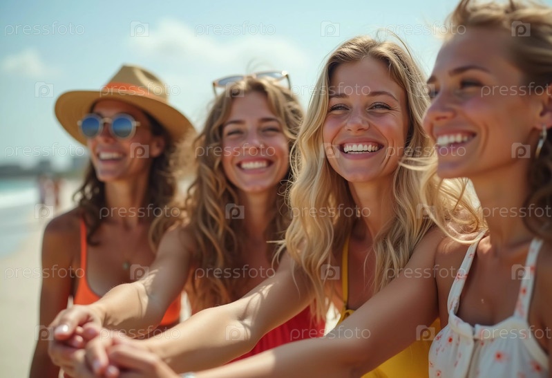 Друзья наслаждаются солнечным днем на пляже, улыбаясь и смеясь во время совместного запечатления веселого момента. Голубое небо дополняет их радостный дух и летнюю атмосферу. Белый песок. Генеративная ИИ