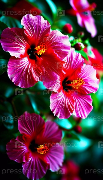 Ярко-красные цветы гибискуса демонстрируют сложные лепестки в процветающем саду. пышная зелень создает яркий фон для их красоты
