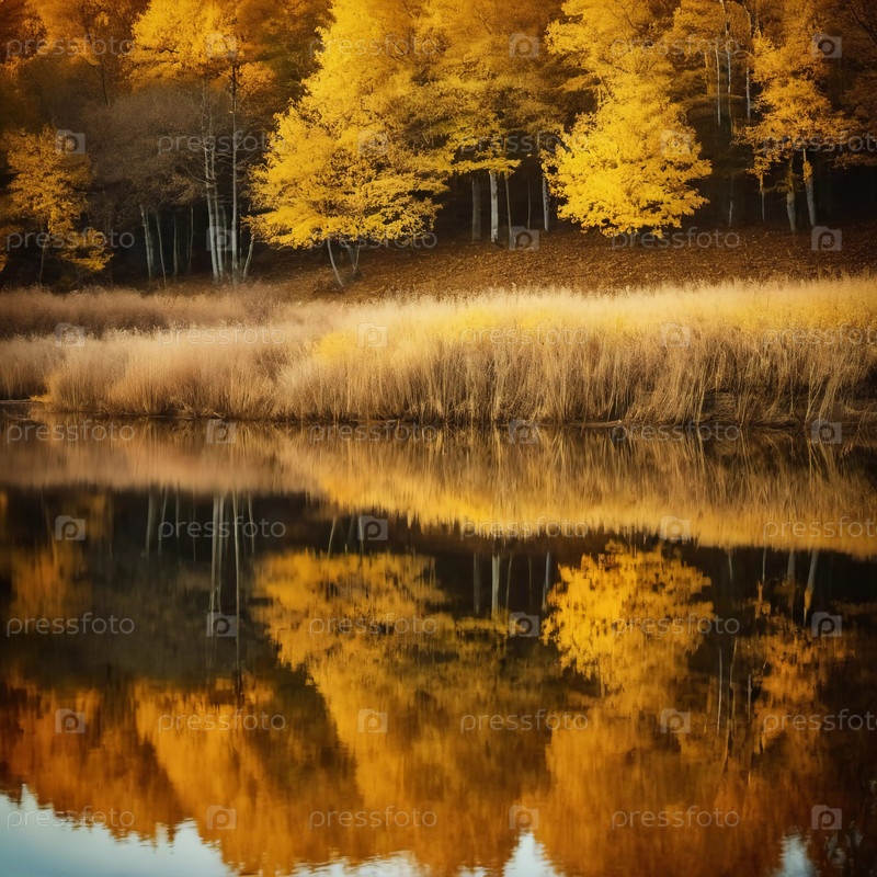 Вибрирующие желтые листья создают потрясающий осенний дисплей вокруг спокойного озера с отражениями, отражающими листву на поверхности воды по мере того как день подходит к концу