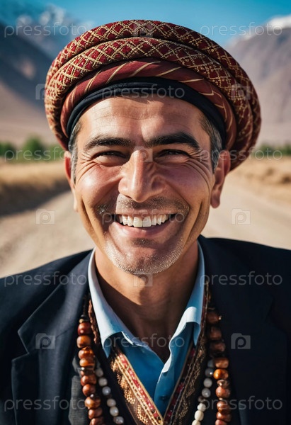 Веселый 45-летний таджикский мужчина в традиционной одежде с яркой улыбкой на потрясающем фоне, излучающий тепло и счастье