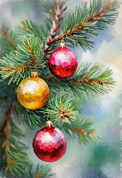 Красочные рождественские украшения украшают ветви пихты, яркие шары в оттенках красного, золотого и розового цветов, воплощающие праздничное настроение зимой