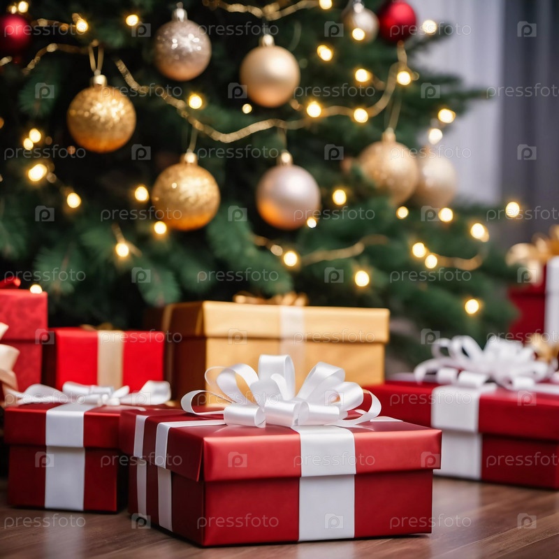 Упакованные в различные цвета подарки сидят под украшенной пихтой, украшенной блестящими рождественскими орнаментами, создавая веселую и праздничную атмосферу для новогоднего торжества